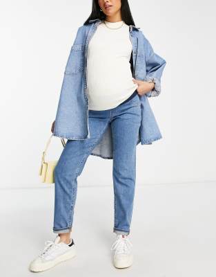 Asos Design Maternity Schmal Geschnittene Mom Jeans In Mittelblauer Waschung Mit Hoher Taille Und Unterbauchbund Asos